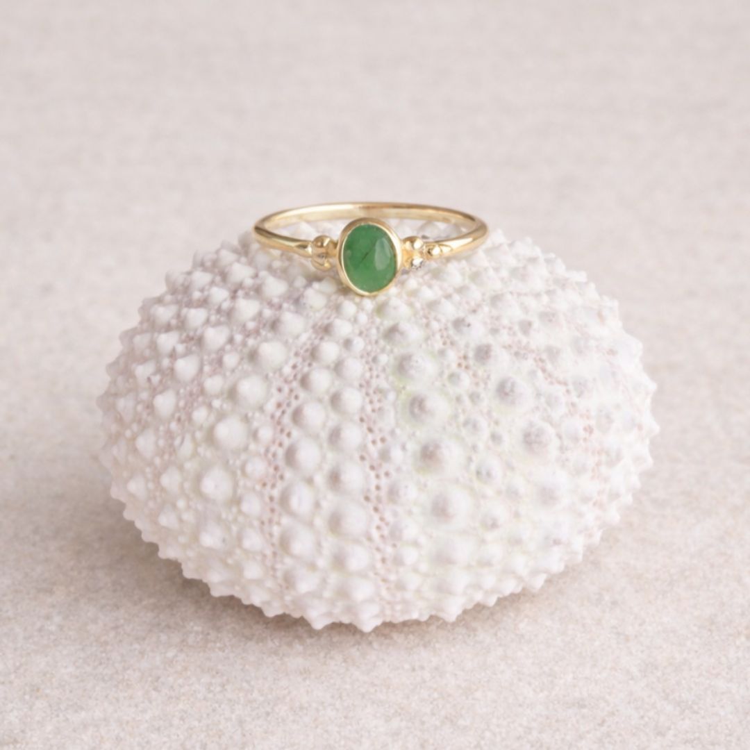 De heldere, diepe groentint van smaragd maakt deze ring bijzonder opvallend. Het is een kleur die levendig aanwezig is en daardoor zowel bij neutrale outfits als bij rijkere, donkerdere tinten prachtig tot zijn recht komt.